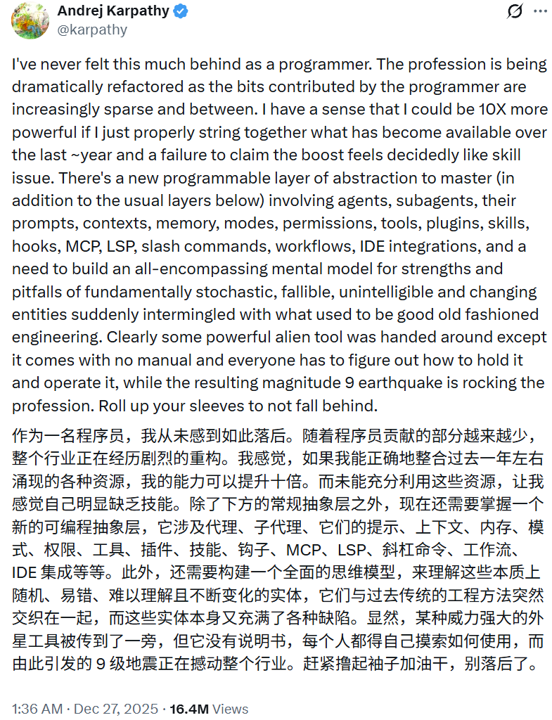 AI 大牛 Andrej Karpathy 在近期的一则超 1600 万浏览的推文中也指出,现在出现了一个全新的「可编程抽象层」需要去掌握。这个层级不仅包含传统的代码逻辑,更涉及智能体、子智能体、提示词、上下文、内存、权限、工具以及重要的 Skill。他认为,如果程序员无法通过整合这些在过去一年里涌现的工具来实现 10 倍效能的提升,那本质上就是一种「技能问题(skill issue)」。在他看来,一种强大的「外星工具」已经交到了人类手中,但它没有附带说明书,所有人都在这场 9 级地震中摸索着如何操控它。他还感叹道:「作为一个程序员,我从未感到如此落后。这个职业正经历着剧烈的重构,程序员直接贡献的代码比例正变得越来越稀疏。」