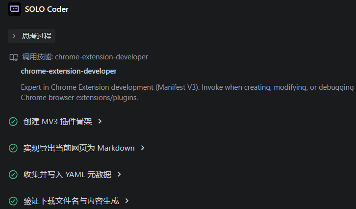 更妙的是,TRAE 对自然语言的支持让创建 Skill 变得极其简单,即便是 0 代码基础也能快速上手。你只需对 TRAE 描述你的需求,它就能自动为你编写一个 Skill。比如下面展示了我们让 TRAE「写一个用于编写 Chrome 插件的 Skill」的全过程:
