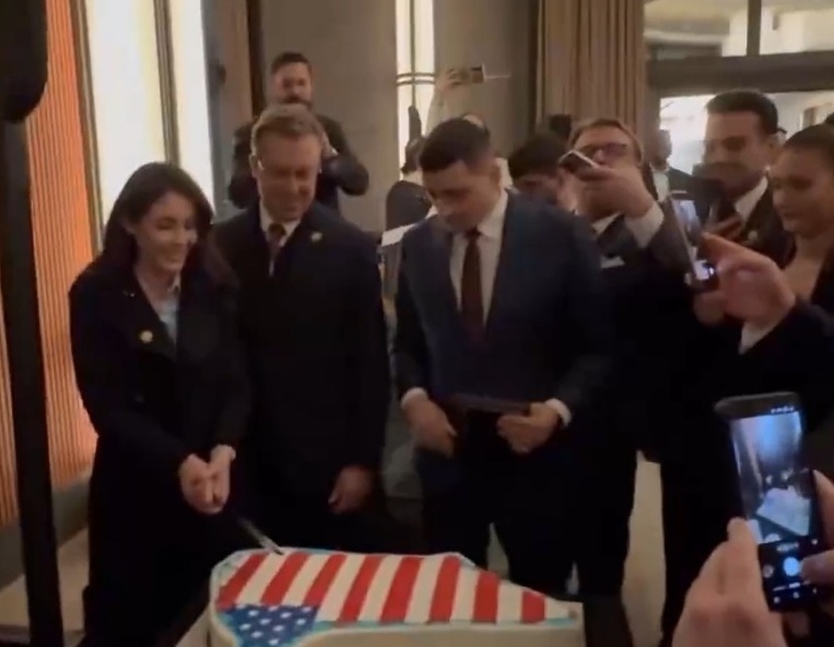 当地时间1月20日晚,在美国首都华盛顿特区的肯尼迪中心,共和党多名议员切开并分享了一块丹麦自治领地格陵兰岛造型、覆盖美国国旗图案的蛋糕。据称,当晚的活动是号称美国“共和党国家复兴”组织成立一周年的聚会。
