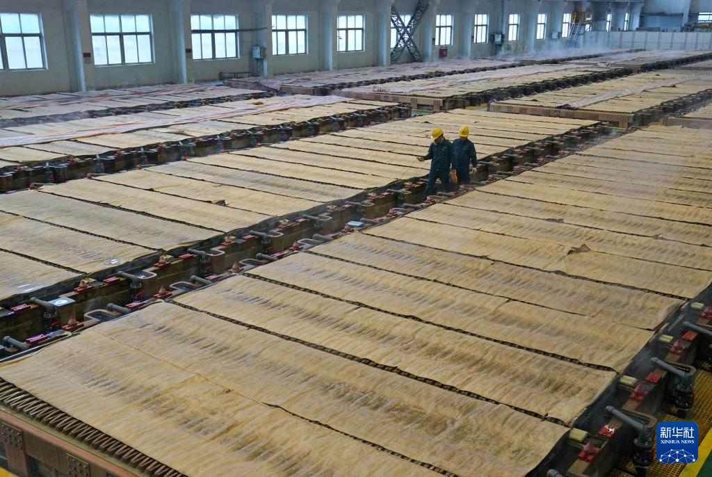 在江铜集团贵溪冶炼厂智能化电解车间,工人查看铜板的电解情况(1月21日摄)。