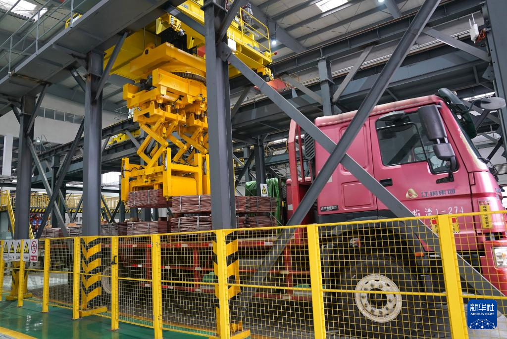 江铜集团贵溪冶炼厂智能化电解车间在进行铜板自动装车作业(1月21日摄)。