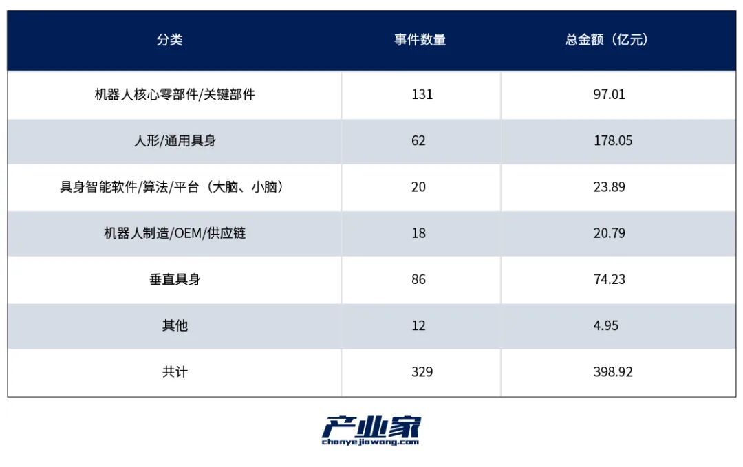 根据IT桔子数据显示,2025年具身智能领域,共发生329起融资事件,同比2024增长219.42%;融资金额更是高达398.9亿元,同比增长3倍之多。