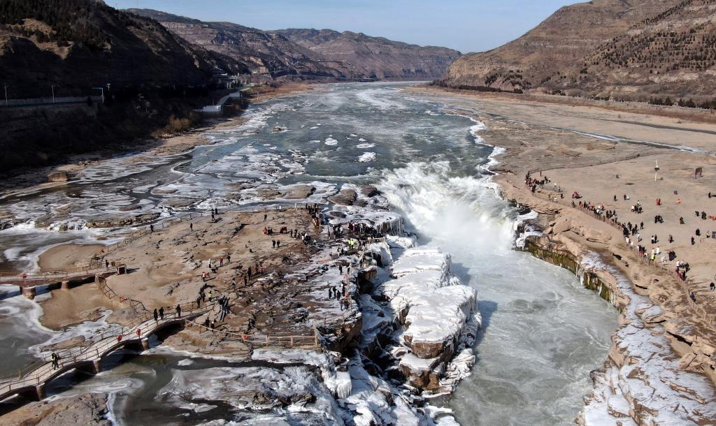 站在壶口瀑布岸边,只见平日里奔腾咆哮的壶口瀑布落差显著变小,只有10米左右,河水裹挟着大量的流凌浮跃而下,在壶口瀑布下游堆积凝结,远远望去,宛若一条白色巨龙静卧在峡谷之中。