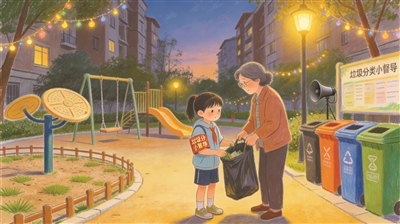 垃圾分类也是我平时常琢磨的事。虽然小区放了四色垃圾桶,可还是有人分不清、投不对,有时垃圾堆得溢出来,味道也不好闻。我想,如果在桶边装个小喇叭,人一靠近就自动播放分类口诀,会不会更管用?我们小学生也可以戴上袖标,轮流当“垃圾分类小督导”,帮邻居指一指、分一分。如果还能设立一个“绿色积分站”,让大家用正确分类的次数兑换垃圾袋、小肥皂这样的日常用品,相信越来越多的人会乐意参与进来。