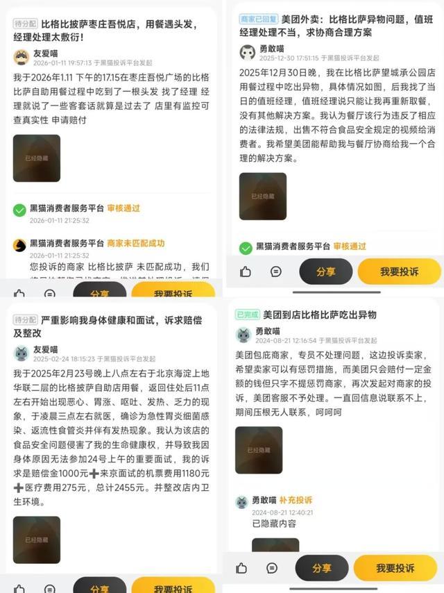 2024年8月,有顾客投诉在比格比萨吃到异物。2025年2月23日晚,也有顾客表示,在北京海淀上地华联店用餐后,出现恶心、呕吐、发热等症状,就医诊断为急性胃炎细菌感染及反流性食管炎。该用户因身体不适错过次日面试,提出2455元赔偿诉求,包含赔偿金、机票及医疗费,并要求整改店内卫生。