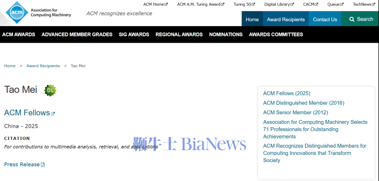1月21日,国际计算机学会(Association for Computing Machinery,ACM)公布2025年度ACM Fellow名单,智象未来创始人兼首席执行官梅涛博士成功当选2025 ACM Fellow。