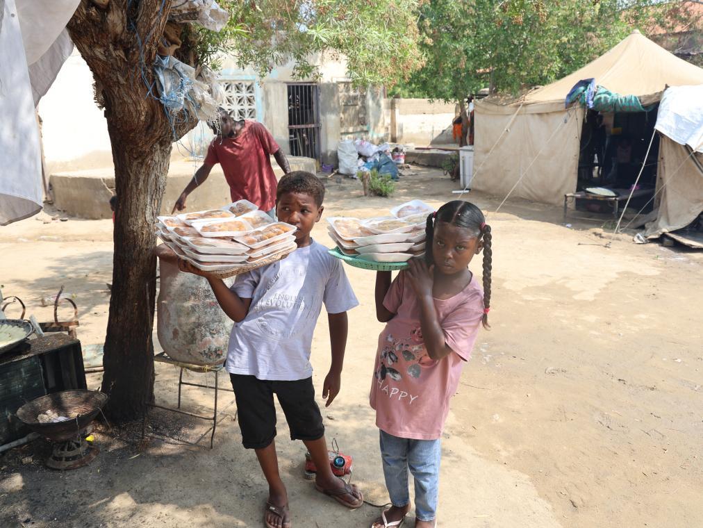 2024年11月12日,在苏丹东部城市苏丹港的一处流离失所者营地,两名儿童准备把制作好的食品拿到市场出售以换取收入。新华社发(法耶兹·扎基摄)