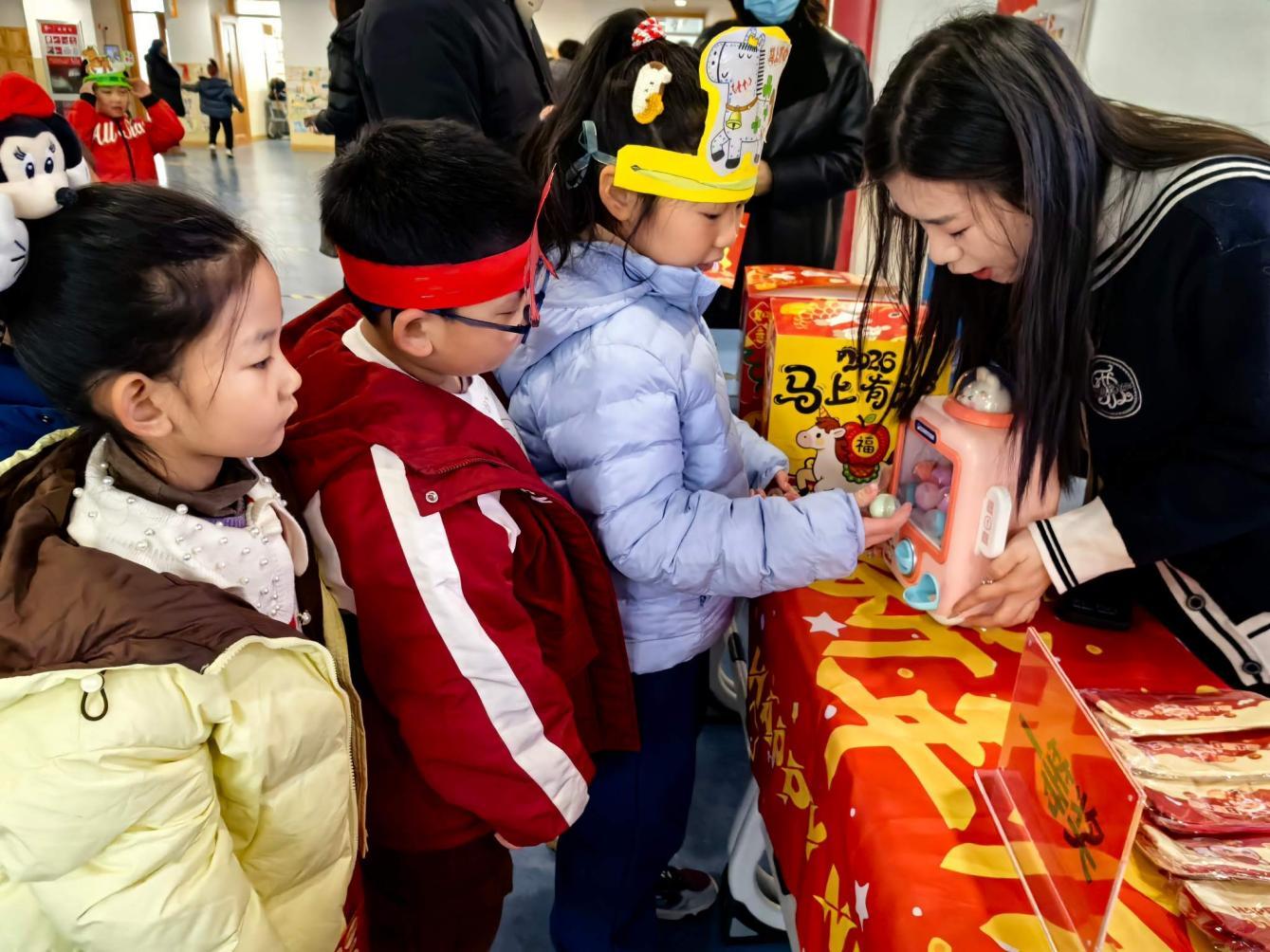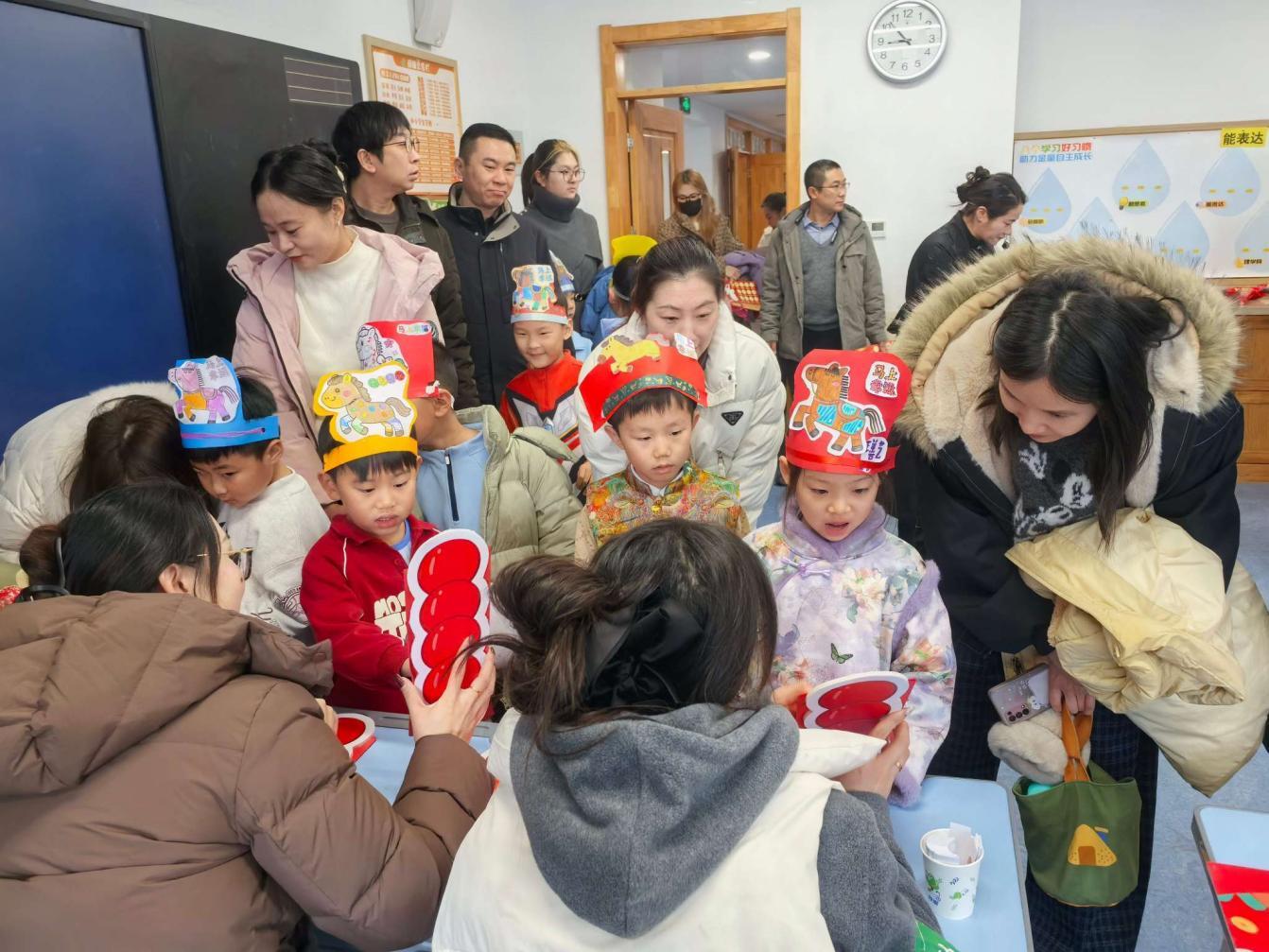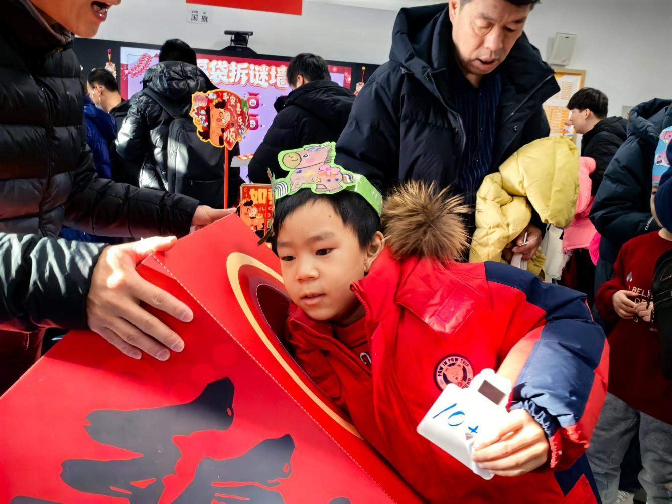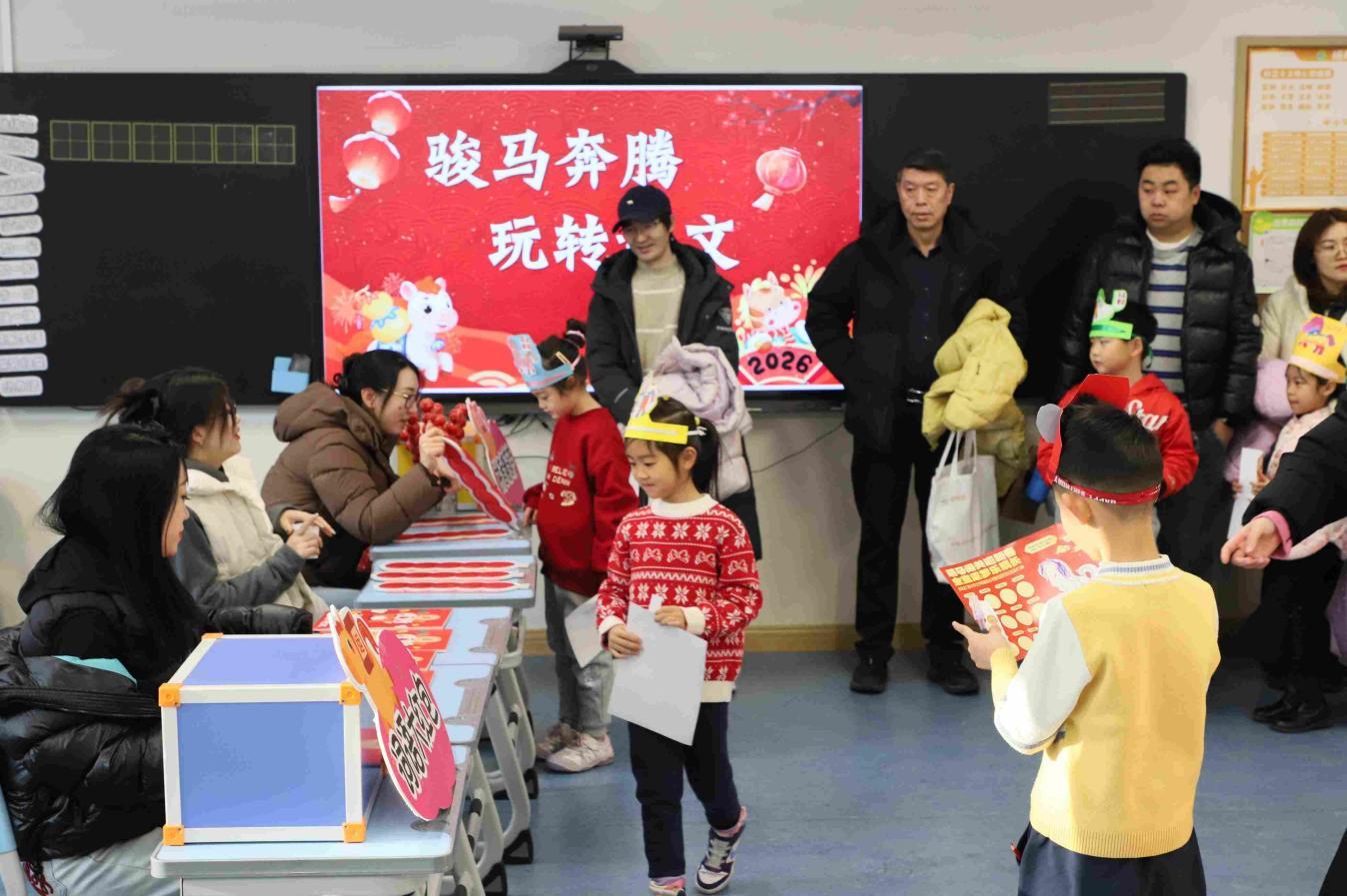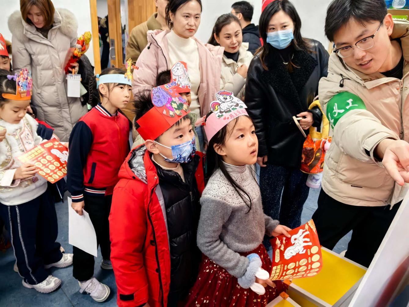美术元素贯穿“乐考”全程,成为独特的成长印记。孩子们佩戴美术课上亲手制作的小马头饰,在老师和家长的陪伴下开启闯关之旅。这份专属手作不仅装点了新春氛围,更化作勇敢闯关的勋章,彰显动手能力与审美素养。