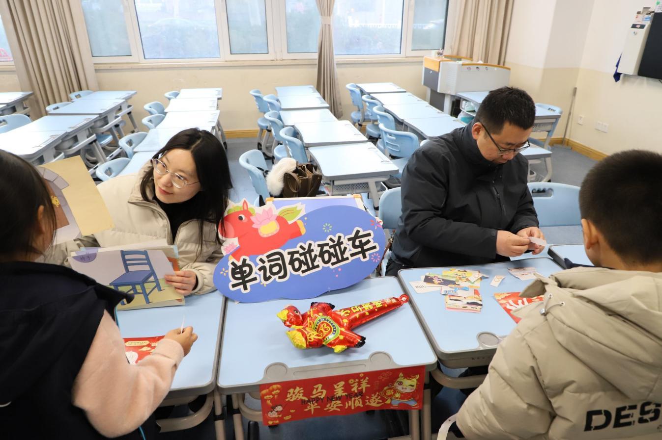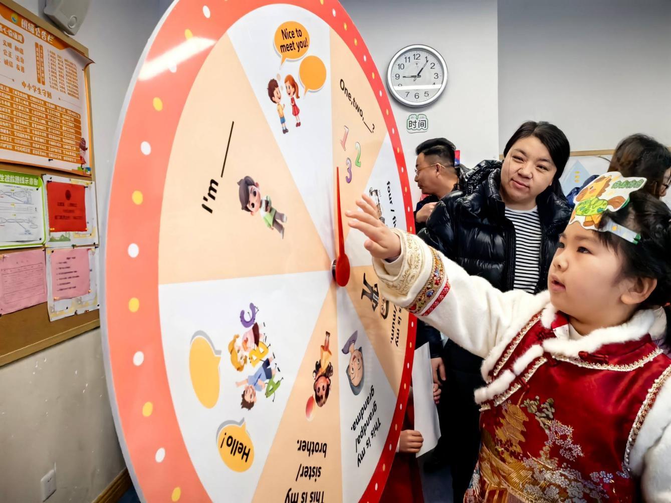 英语关卡中“字母小马驹”们跃入缤纷字母海。“单词碰碰车”环节,孩子们在互动中碰撞单词记忆火花,快速反应认读;“幸运大转盘”转出随机单词任务,家长义工耐心引导,鼓励孩子们勇敢开口表达,在轻松氛围中展现英语风采,提升语言运用能力。