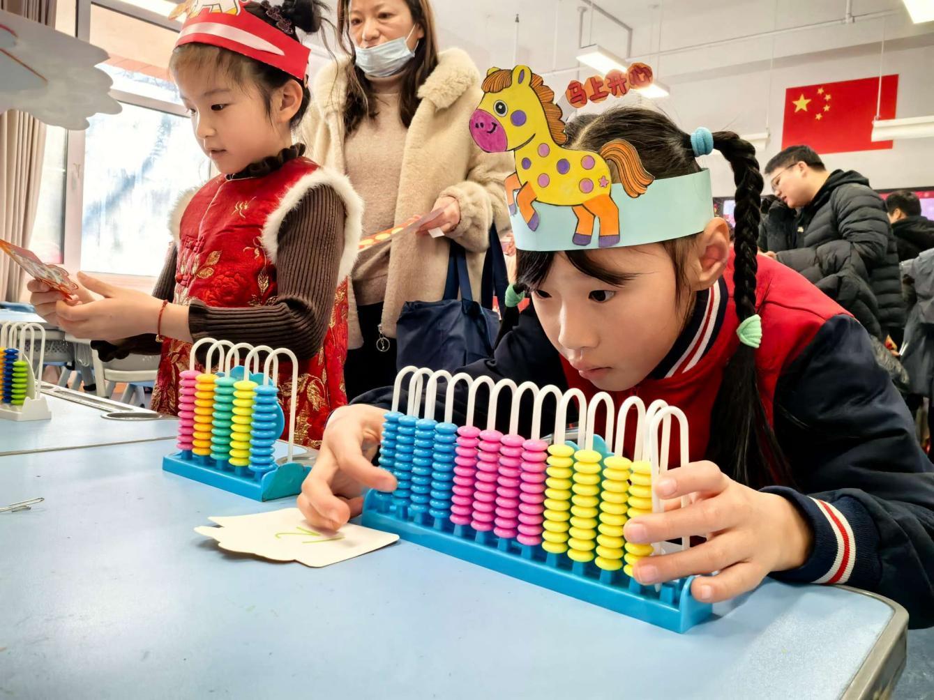 数学不再是枯燥的算式,而是藏在游戏里的智慧密码。在“小马口算坊”,小萌马们飞速运转大脑,精准报出答案,争当速算小达人;“福袋拆谜墙”里,一个个福袋藏着数学谜题,拆出惊喜与挑战;“巧手拨珠台”上,小手拨动算珠,在实操中理解数的奥秘;“盲盒辨形站”中,触摸盲盒里的图形,凭借空间感知力准确辨识,每一次闯关都充满成就感。