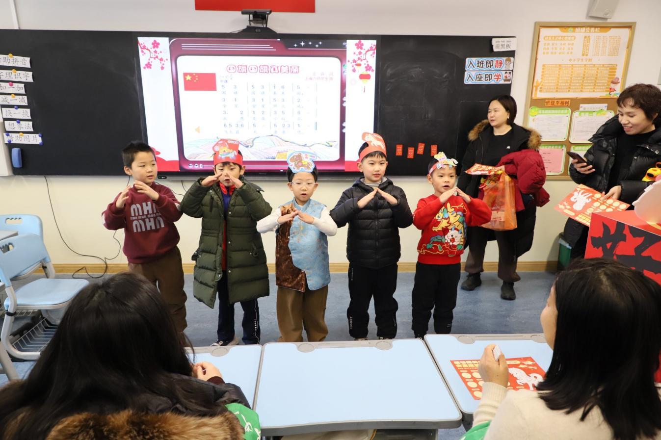语文“乐考”挑战层层递进,让语文学习充满年味与趣味。“拼音糖葫芦”串起声母韵母,孩子们流利拼读,收获甜甜的知识果实;“词语大红包”藏着满满惊喜,认读词语、灵活运用,把知识装进红包带回家;“古诗滚滚乐”转动幸运转盘,经典古诗脱口而出,诵读声里满是文化韵味;“童说扫年货”环节,孩子们围绕年货主题尽情表达,展现丰富想象力与语言建构运用能力。
