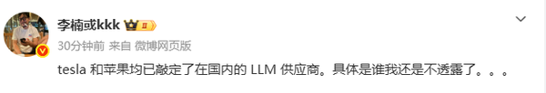 【CNMO科技消息】1月23日,CNMO注意到,前魅族科技高级副总裁李楠发文透露,特斯拉和苹果均已敲定国内LLM供应商,计划通过深度合作推动AI功能在华落地。