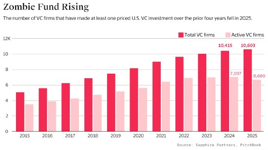 “风险投资行业向来存在赢家与输家的分化,” 主导此次数据分析的蓝宝石投资伙伴公司合伙人比泽・克拉克森指出,“这里的赢家指的是业绩出众、能够持续募集新资金的基金,输家则相反。但此前,我们从未见过活跃基金数量出现如此明显的收缩。”