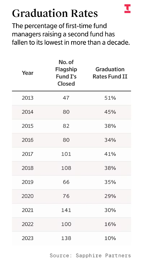 活跃基金数量下滑,源于 2020 年以来新成立风险投资基金的激增。当时疫情期间的低利率环境,促使大量风险投资人选择独立创业。仅 2021 年一年,首次募资的基金管理人就新成立了 141 只基金。但蓝宝石投资伙伴公司估计,其中仅有 30% 的管理人成功募集到第二只基金,这是至少自 1995 年以来的最低 “晋级率”。2022 年的情况则更为糟糕,当年新成立的 100 只基金中,仅有 16% 的管理人顺利完成二次募资。