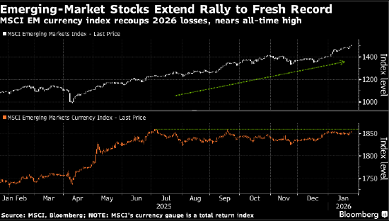 在美国与欧洲关系紧张之际,美元承压,全球各地资产分散配置的势头再起,新兴市场股票、货币与贵金属延续2026年以来的强劲开局。