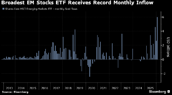 随着资金从美国资产向外轮动的势头增强,投资者正以纪录速度向新兴市场基金投入资金,推动新兴市场股票指数升至纪录高位。