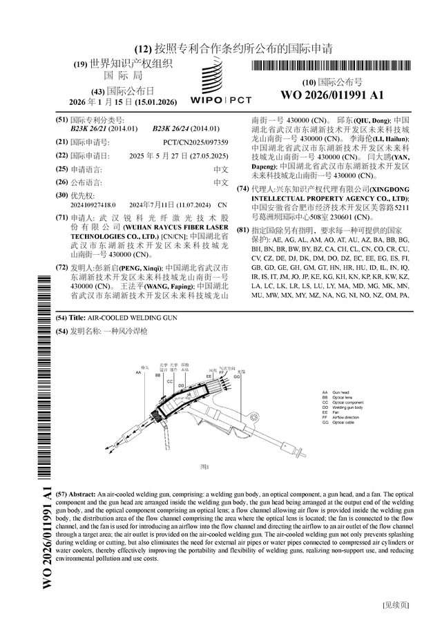 证券之星消息,根据企查查数据显示锐科激光(300747)公布了一项国际专利申请,专利名为“一种风冷焊枪”,专利申请号为PCT/CN2025/097359,国际公布日为2026年1月15日。