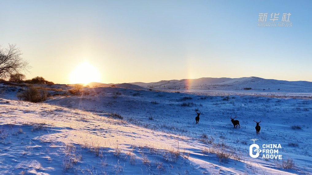 这是草原生灵与酷寒气候的和谐共生,是冬日里最鲜活的生命礼赞。马鹿的雄健身姿与幻日、雪原构成绝美画卷,定格下锡林郭勒草原独有的冬日生机。
