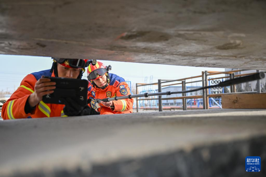 1月22日,在新疆乌鲁木齐消防救援机动支队库尔勒大队,消防员利用雷达生命探测仪,模拟对墙体一侧被困人员进行搜索标记。