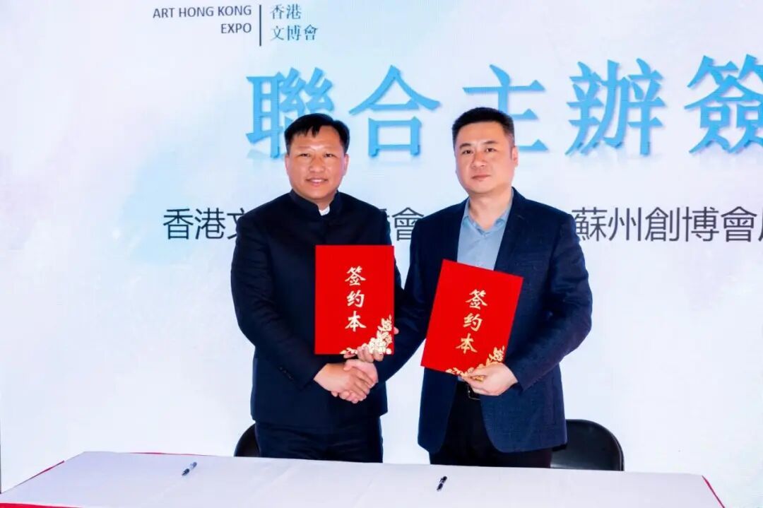 ▲ 第四届香港文博会合作签约仪式 ,左为:香港文博会组委会执行主席皮取兵,右为:苏州国际博览中心管理有限公司副总经理/苏州创博会展览有限责任公司总经理叶喜春
