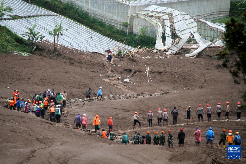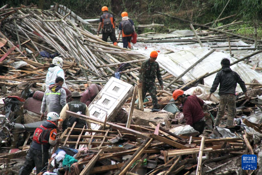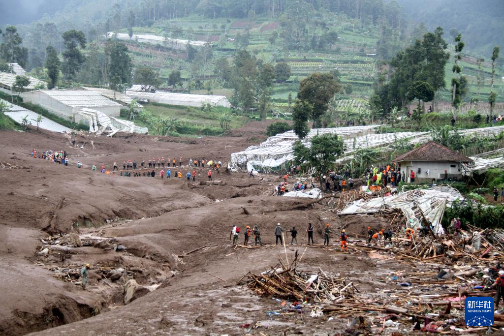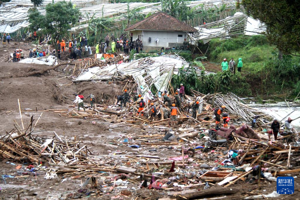 1月24日,在印度尼西亚西爪哇省西万隆县,救援人员在山体滑坡现场搜救。新华社发(塞提安贾尔摄)