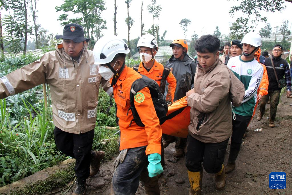 1月24日,在印度尼西亚西爪哇省西万隆县,救援人员转运遇难者遗体。新华社发(塞提安贾尔摄)
