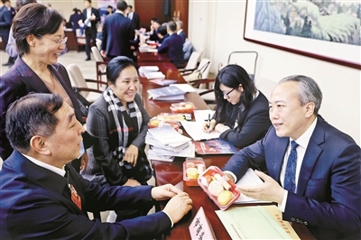 市商务局局长朴学东(右)向代表委员介绍北京稻香村最新推出的马年主题“哒哒饼”