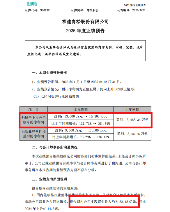 1月23日,诺斯贝尔母公司福建青松股份有限公司(以下简称“青松股份”)发布2025年业绩预告,预计净利润为正值且属于同向上升50%以上情形。依据这一情况,青松公司预计2025年营收或将达22亿,净利暴涨近200%。