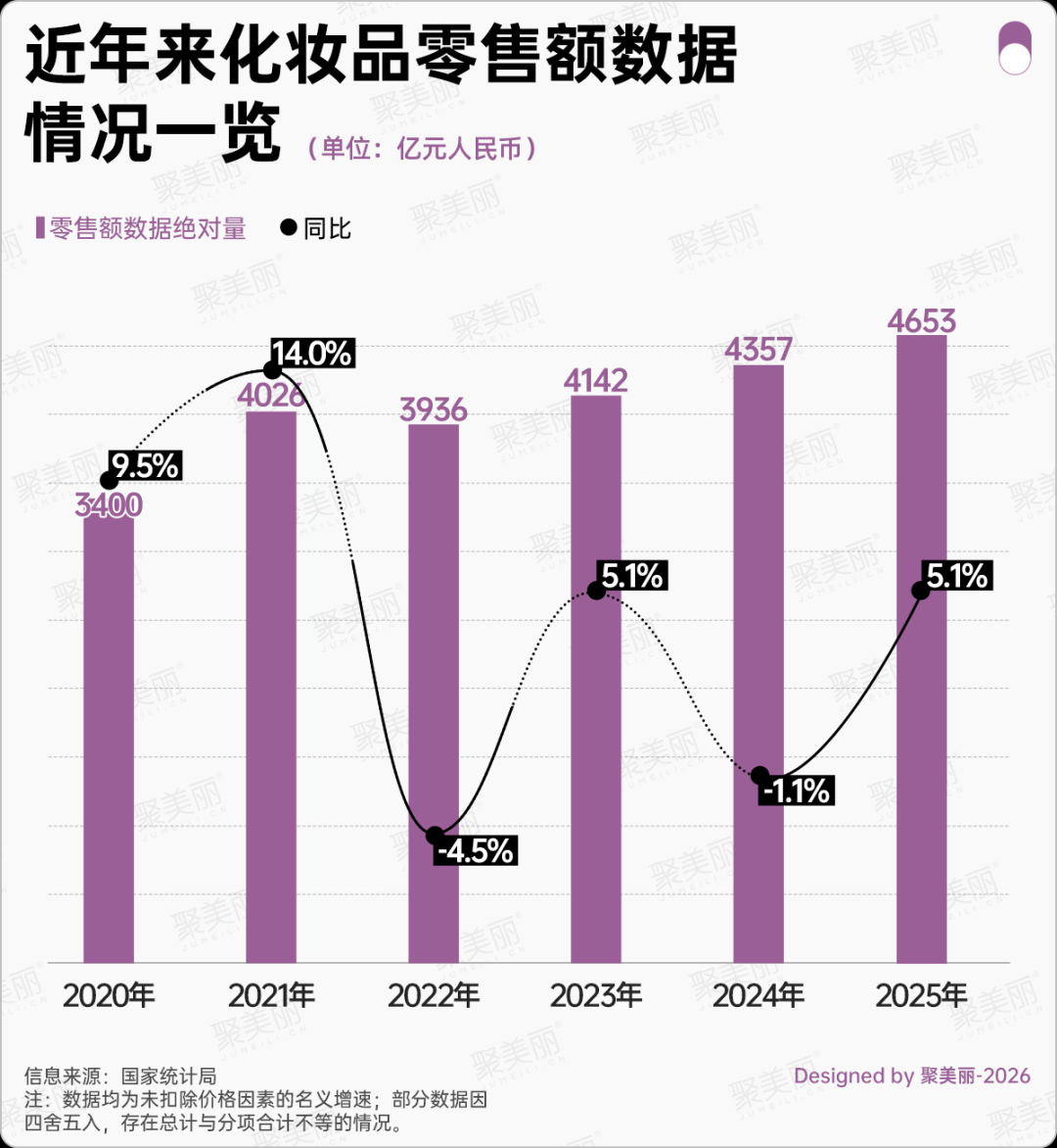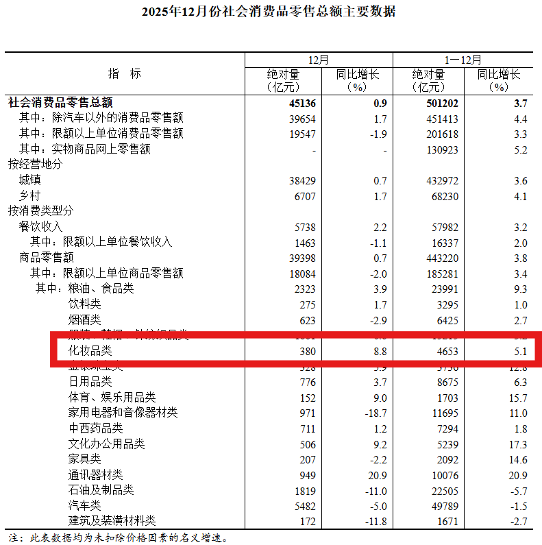 作为消费细分领域的重要品类,化妆品行业表现优于整体大盘。2025年全年化妆品零售额4653亿元,同比增长5.1%,增速较社会消费品零售总额高出1.4个百分点。其中12月单月化妆品零售额380亿元,延续高个位数增长态势。