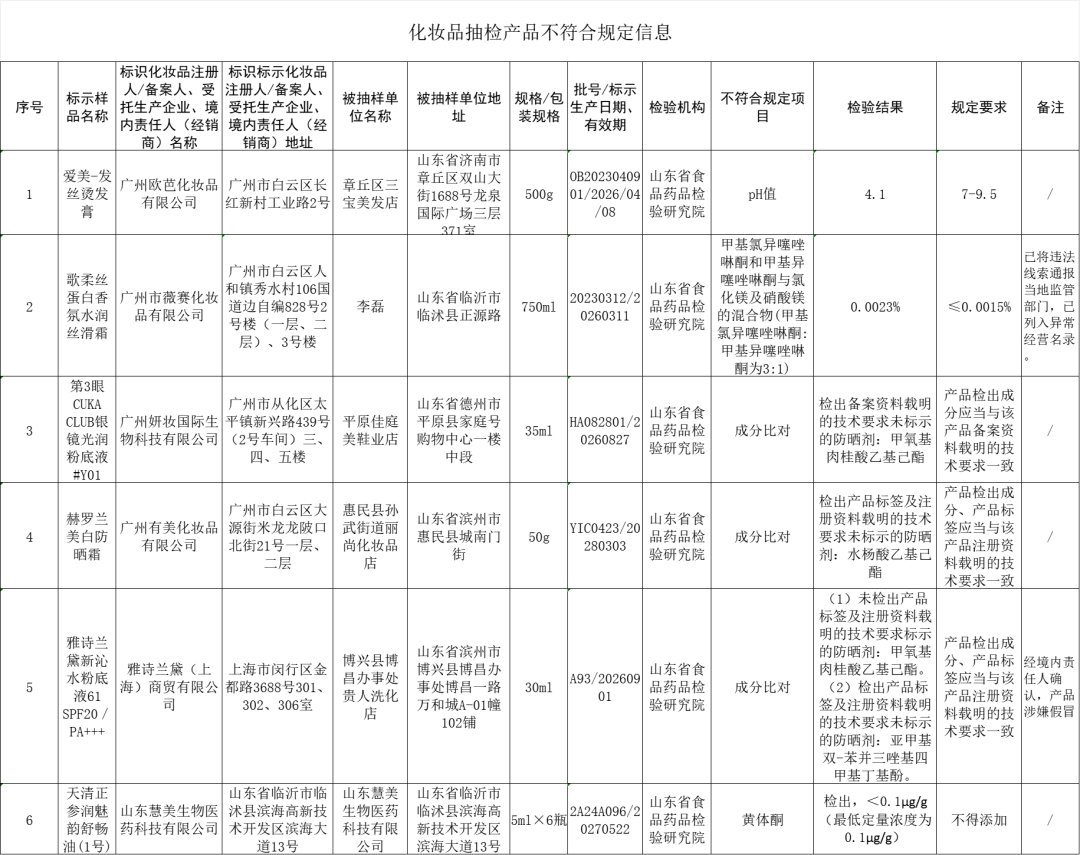 此前,山东省药品监督管理局(以下简称“山东药监局”)发布了关于化妆品抽样检验结果的通告,通报6批次不符合规定的化妆品,涉及染发、洗护、彩妆、防晒等多领域,不合规原因涵盖成分对比不符、pH值过低、防腐剂超标、检出黄体酮等问题。