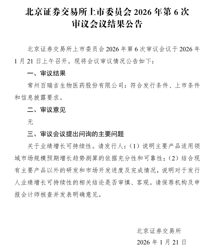 1月21日,北京证券交易所宣布常州百瑞吉生物医药股份有限公司(以下简称“百瑞吉”)符合发行条件、上市条件和信息披露要求,予以过会。