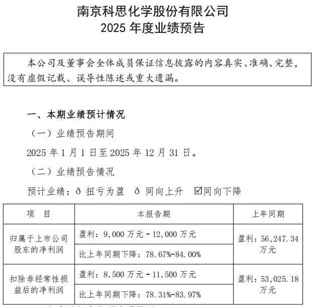 1月21日,南京科思化学股份有限公司(以下简称“科思股份”)发布2025年度业绩预告,预计业绩将同向下降。