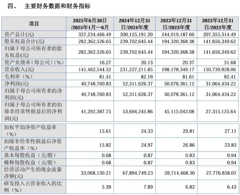 据其此前披露的招股书,近年公司业绩表现亮眼。2022~2024年,营收从1.5亿元跃升至2.3亿元,净利润自3106万元攀升至5231万元,2025上半年营收录得1.4亿元、利润达4074万元,营利双增长。