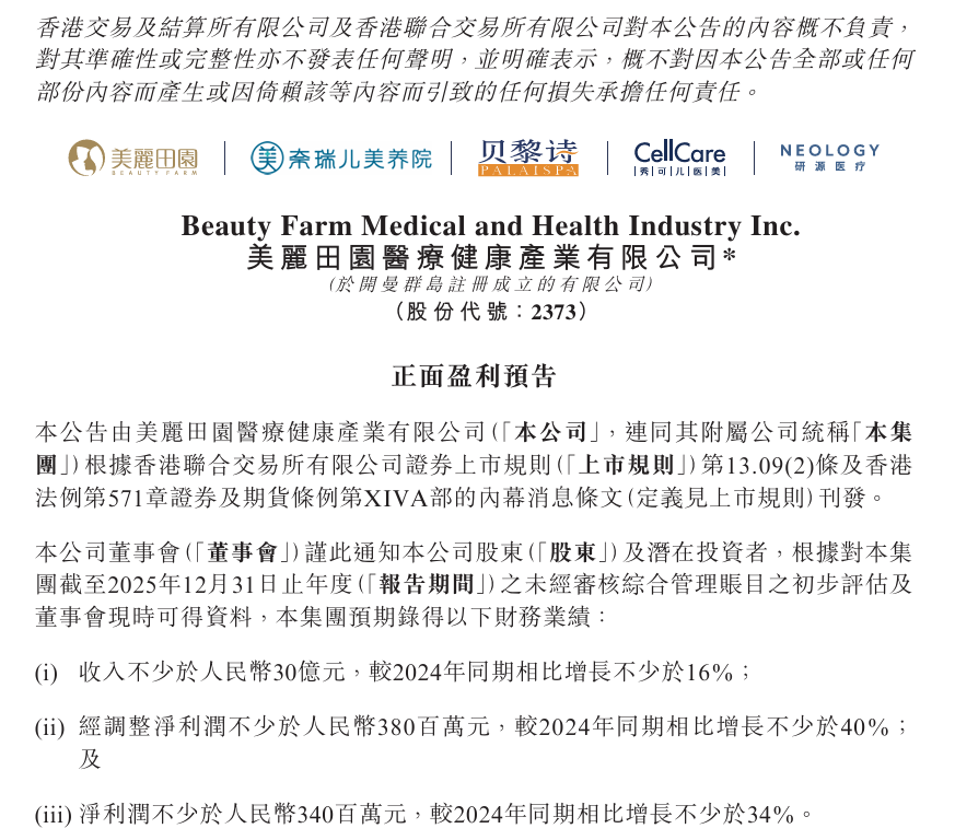 1月19日,美丽田园医疗健康(以下简称“美丽田园”)发布2025年正面盈利预告。公告披露,美丽田园2025年营收不低于人民币30亿元,较2024年同期增长不少于16%;经调整净利润不少于人民币3.8亿元,较2024年同期增长不少于40%。
