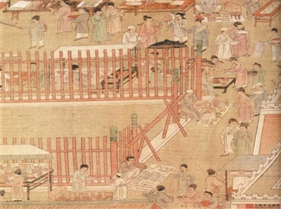 社会风情的鲜活百态,让《皇都积胜图》充满人间烟火。画中两千余位人物涵盖工匠、商人、官员、艺人等各个阶层,构成一幅立体的明代社会图景。朝前市作为核心商业区,“肩摩毂击,竟日喧嚣”,绸缎庄的幌子随风飘荡,珠宝铺的玛瑙翡翠流光溢彩,煤铺老板指挥着骆驼队卸货储能,资本雄厚的商号甚至自养骆驼或自备大车,直采京西煤窑。棋盘街的书市尤为雅致,士大夫办完公事后在此流连,举子们赶考之余寻访典籍,孙承泽笔下“倾囊购得赵孟頫真迹”的佳话便诞生于这书墨飘香的市集之中。