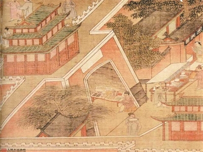 建筑形制的规整有序,是《皇都积胜图》最鲜明的视觉语言。画作严格遵循明代北京“宫城—皇城—内城—外城”的四重格局,将皇权至上的空间秩序展现得淋漓尽致。承天门(今天安门)以内的皇城区域,殿宇巍峨、宫墙高耸,不见一丝商业烟火,凸显“宫禁之地”的肃穆庄严;大明门至承天门之间,衙署林立、卫兵肃立,作为行政中心的规整布局,彰显着国家机器的运转秩序。这座城商业空间布局和政治空间布局的明确划分,在正阳门至大明门的“朝前市”达到极致——一墙之隔,一边是威严的朝堂礼制,一边是喧嚣的市井繁华。