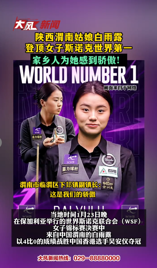 当地时间1月23日晚,在保加利亚举行的世界斯诺克联合会(WSF)女子锦标赛决赛中,来自中国渭南的白雨露以4比0的成绩战胜中国香港选手吴安仪夺冠。凭借此胜,她首次登顶女子斯诺克世界第一的宝座,这也是亚洲第三位达成这一成就的女球手。
