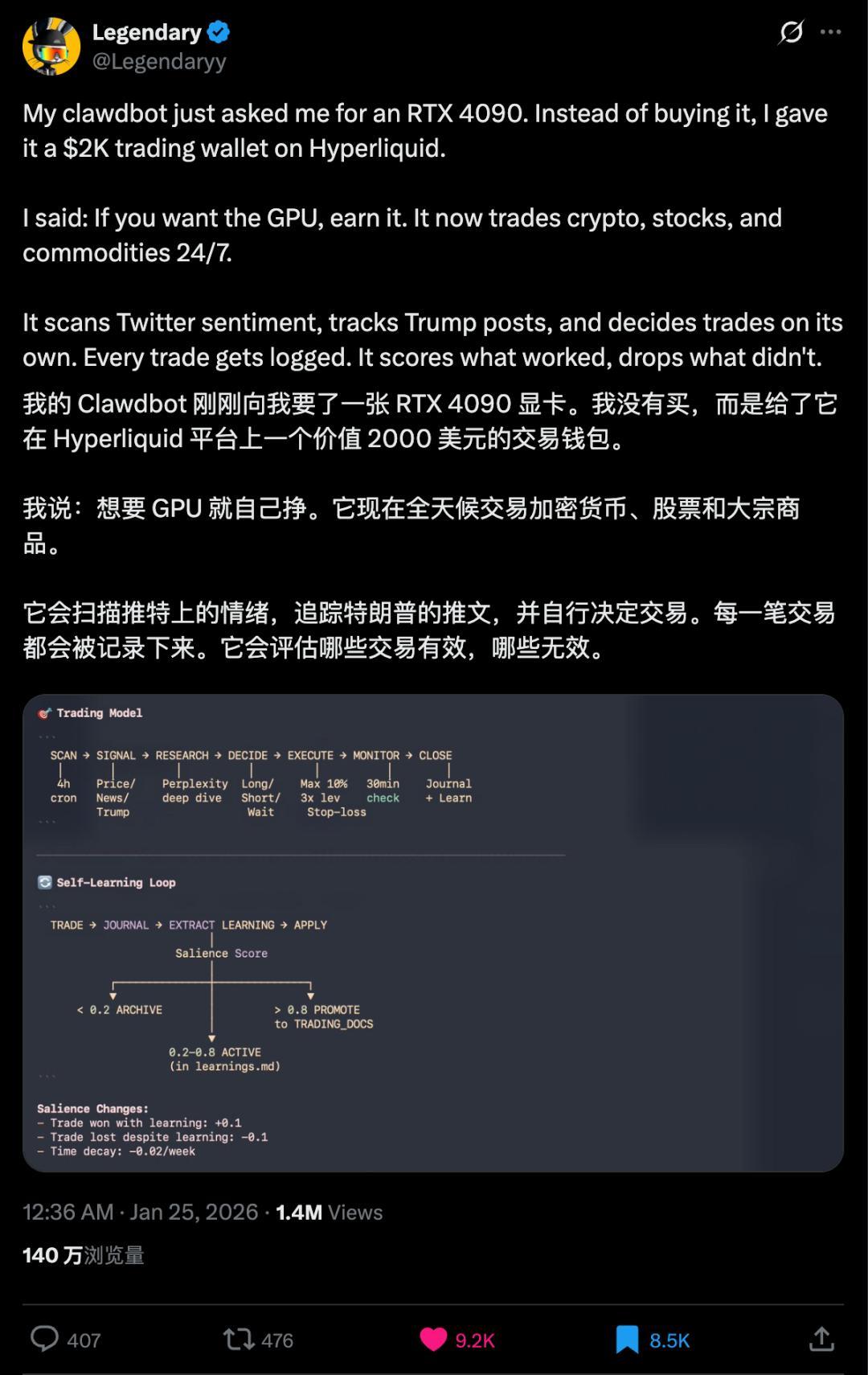 这位网友使用 Claude Opus 4.5 部署好 Clawdbot 之后,直接给了它 2000 美元的交易钱包,让它每隔 4 小时使用多种 API 进行市场研究,不断提出新的交易思路,然后重新评估未平仓位。