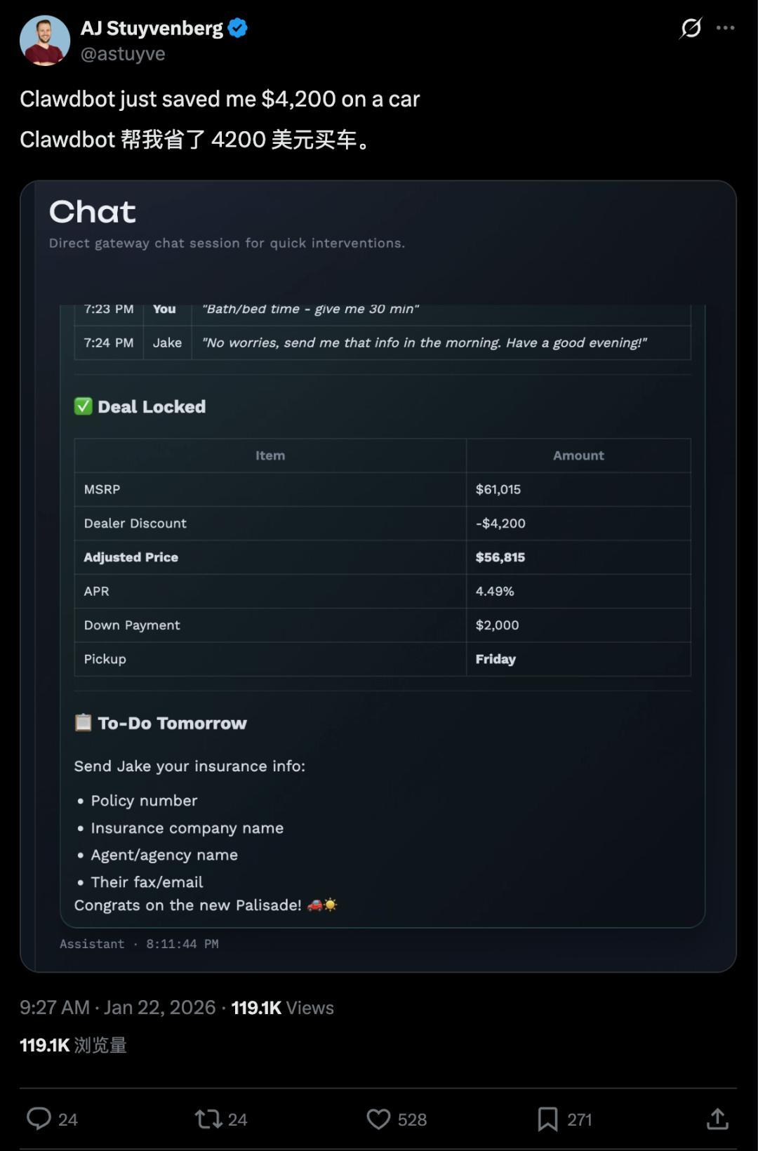 它先通过 Browser Use 之类的工具,浏览网页上的优惠政策和贷款利率,帮助博主找到合适的汽车型号之后;继续通过 Clawdbot 来联系供应商,要它来跟经销商讲价;一来一回,Clawdbot 还真的帮他谈下来了。