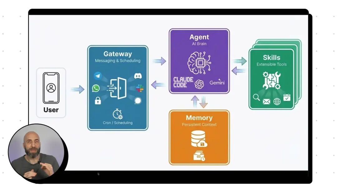 就像这个架构图所描述的,以前的 Chatbot,我们只是能和他说几句话,或者生成几张图片。 但是 Clawdbot 的架构,是由 Gateway 网关、Agent 智能体、Memory 记忆,以及 Skills 技能共同组成。