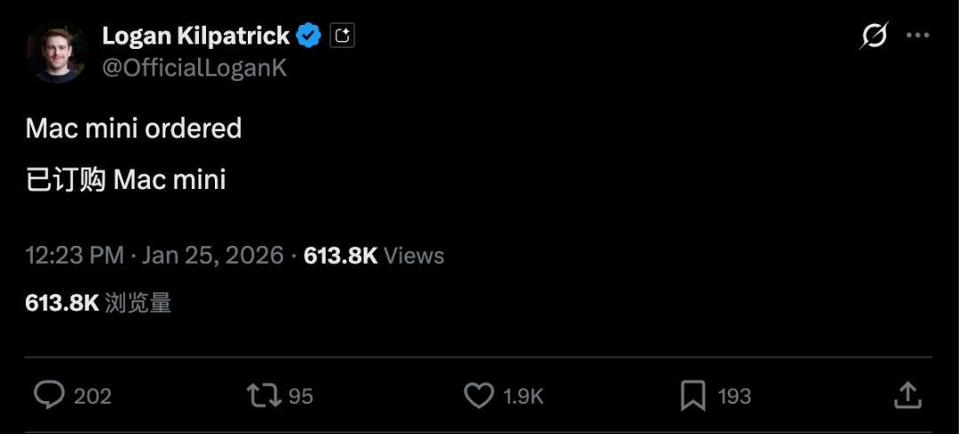就连 Google AI Studio 的负责人,Logan Kilpatrick 都发 X 说,「我已经下单了 Mac mini」。