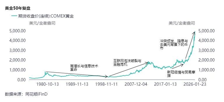 市场多数人士认为本轮黄金牛市从2019年起,若以此计算,金价已从1300美元/盎司升至5000美元/盎司(+280%),走过了7个年头。