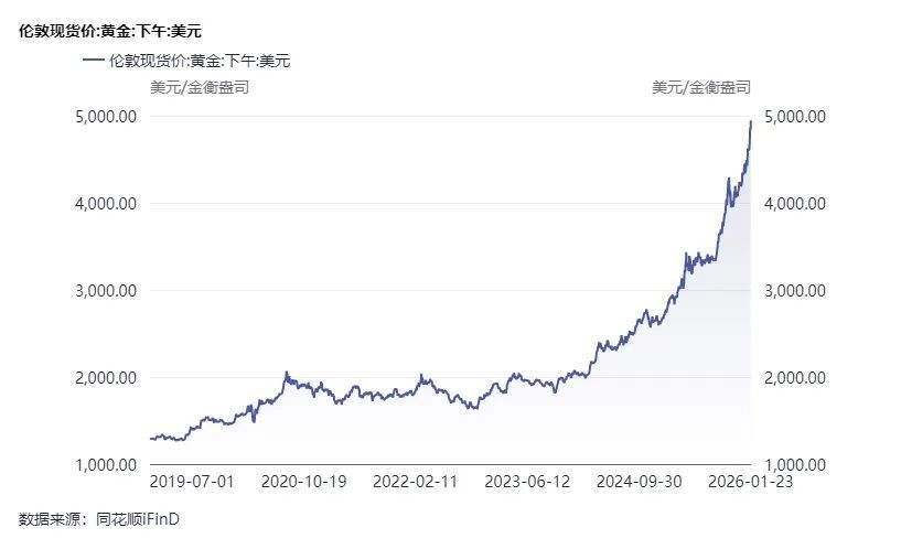 金价势如破竹,截至1月26日,已冲破5000美元/盎司大关。