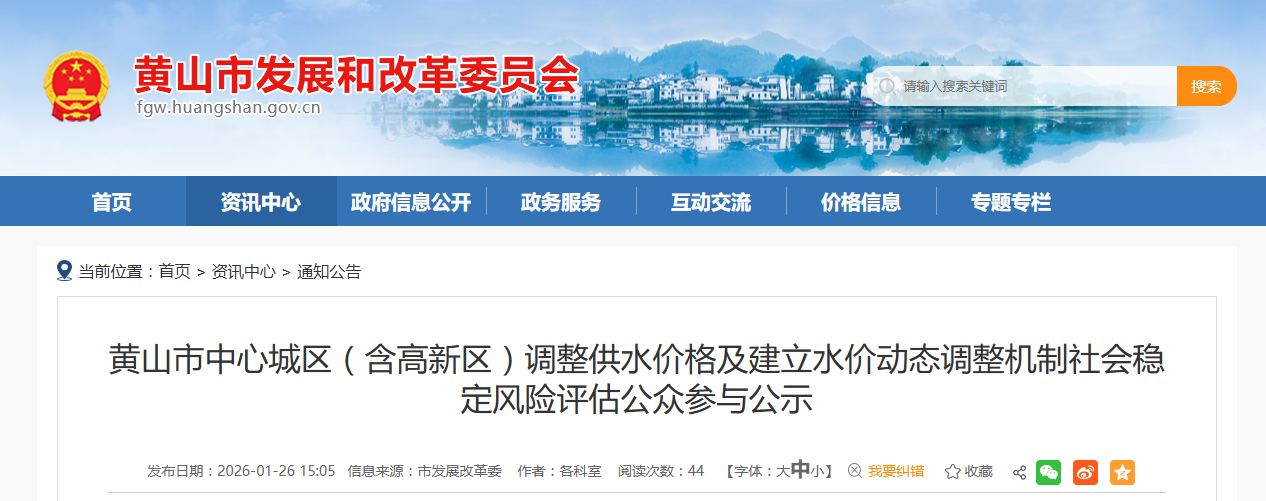 黄山市中心城区(含高新区)调整供水价格及建立水价动态调整机制社会稳定风险评估公众参与公示