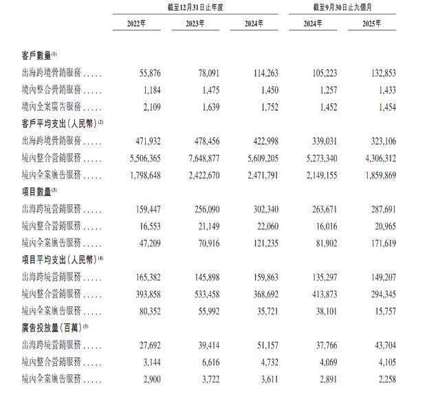 具体看,公司出海业务客户数两年内翻倍,2022年约为5.6万,2024年则约11.4万。然而,单客平均年支出却从47.2万元降至42.3万元,两年下滑超10%。2025年前九个月进一步降至约32.3万元,呈现量增价跌的趋势。