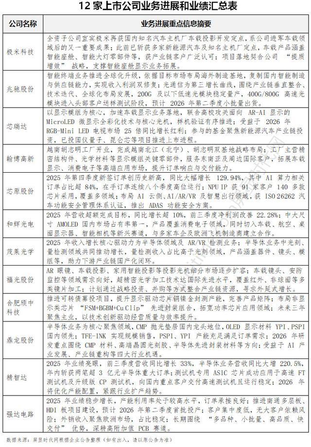 近期,极米科技、兆驰股份、芯瑞达、翰博高新、芯原股份、和辉光电、茂莱光学、福光股份、颀中科技、鼎龙股份、精智达、强达电路12家深耕半导体、显示面板、车载及光学配套核心赛道的上市公司,陆续通过企业公告、投资者关系活动、官方公众号等渠道,披露了最新业务突破、业绩成绩单及中长期战略布局,集中展现了国内核心产业链的发展活力与创新态势。