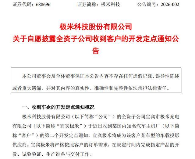 近日,极米科技股份有限公司(证券代码:688696,证券简称:极米科技)发布公告称,其全资子公司宜宾市极米光电有限公司(以下简称 “宜宾极米”)收到某国内知名汽车主机厂的第二个开发定点通知,宜宾极米将正式成为该客户某车型的车载投影供应商。
