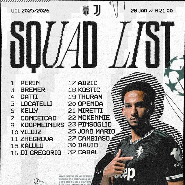 北京时间1月27日,尤文图斯公布了欧冠联赛阶段末轮他们做客挑战摩纳哥的大名单,凯南-伊尔迪兹领衔,乔纳森-戴维、凯夫伦-图拉姆以及布雷默在列,三号门将平索利奥回归。