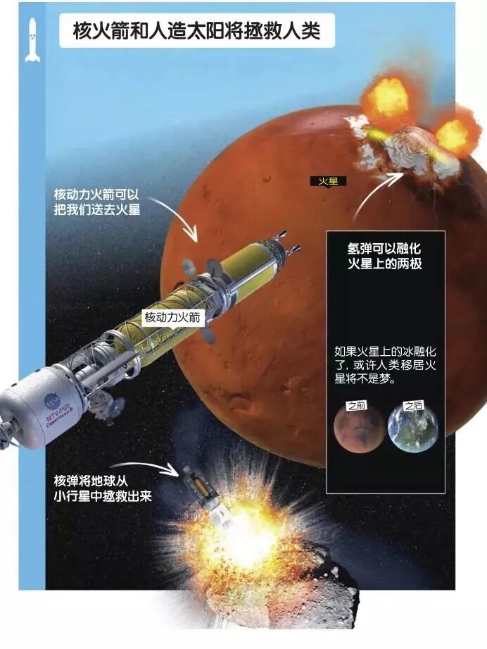 目前,火星是不适宜居住的,但这个贫瘠的星球可能会被原子弹改造成新的地球。美国特斯拉公司总裁埃隆•马斯克建议在火星的周围引爆氢弹,氢弹爆炸产生的热量像小太阳一样融化火星两极的冰。火星上将产生大量的液态水,形成的海洋将释放二氧化碳,二氧化碳会上升到大气中并产生温室效应。这样,冰冷的火星将被加热成适宜居住的温暖星球。而核动力驱动的火箭可以把我们送去火星,这种核裂变发动机的效率是传统化学火箭发动机的两倍,可以在火星之旅中节省18个月的时间。