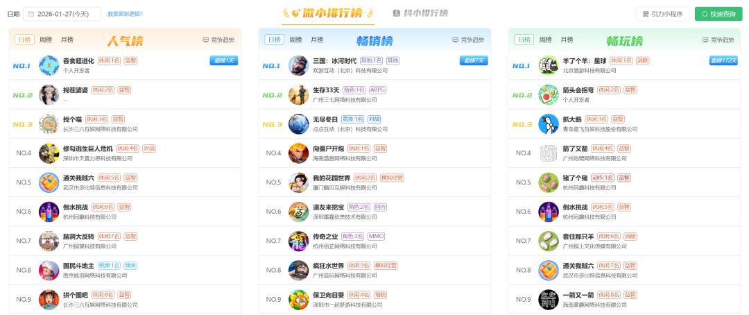 随手翻开小游戏畅销榜单,三七互娱、大梦龙途、豪腾嘉科等老牌大厂的名字频繁出现;再往近了聊,代表小游戏新势力的巨人网络、贪玩游戏、诗悦网络等厂商,近两年也都在市场一线崭露头角。